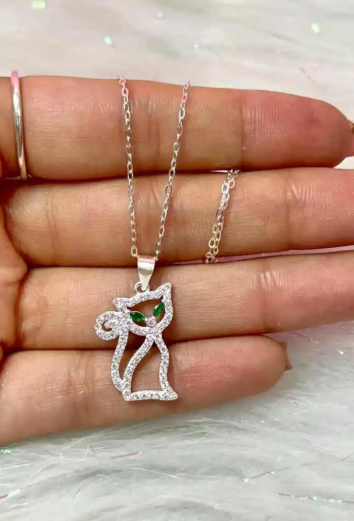 Este hermoso collar con colgante de gato es el accesorio ideal para quienes aman el misterio, la elegancia y los felinos. Su silueta estilizada está decorada con brillantes que aportan un toque de glamour, mientras que sus impactantes ojos verdes añaden carácter y encanto. Perfecto para destacar cualquier outfit con un aire sofisticado y divertido. Ideal para regalo o para consentirte con una joya única y con estilo.