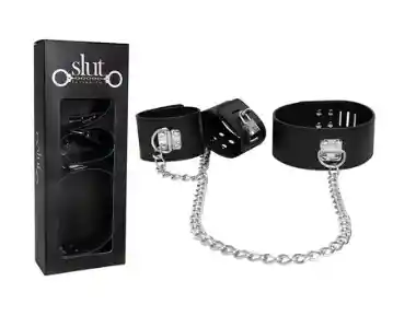 Reduce el movimiento del cuerpo de tu pareja con este collar que tiene extensión de esposas para manos con un pequeño candado de seguridad. Material: Cuero sintético y metal Talla única Color: Negro Contiene: Collar y Esposas