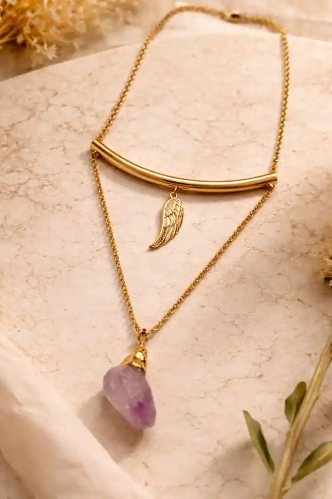 Collar en bronce con baño en oro 24k y dije al y piedra amatista. elaborado artesanalmente que integra en su diseño único diferentes elementos que lo llenan de simbolismo. Es una pieza atemporal que brinda múltiples oportunidades para combinarlo. Al ser una pieza ensamblada de forma artesanal el producto entregado puede presentar diferencias de colores y acabados al expuesto en la fotografía;Características principales: . Tipo: Cadena en bronce con baño en oro de 24k .Dije: Ala y piedra amatista . Diseño: Único con elementos llenos de simbolismo .Estilo: Atemporal con múltiples opciones de combinación . .Elaboración: Artesanal con posibles variaciones en colores y acabados .Garantía: 30 días en acabados bajo condiciones normales de uso
