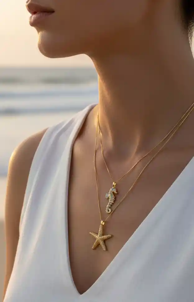 Dos símbolos del océano en una sola pieza en Oro Goldfield. La estrella representa guía y luz; el caballito de mar, fuerza y delicadeza.