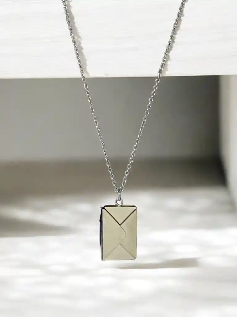 ¡Lleva tus recuerdos más preciados siempre contigo! Este impresionante collar está fabricado en acero inoxidable de alta calidad, diseñado para perdurar con su brillo intacto. El colgante en forma de sobre, delicadamente detallado, se abre para guardar pequeños recuerdos, como una nota especial o una foto diminuta. Es el accesorio perfecto para quienes valoran los detalles personales y desean un toque elegante y moderno en su estilo diario. ¡Haz que cada día cuente con este collar único! Consejos de Cuidado y Uso: Limpieza Regular: Mantén tu collar en perfectas condiciones limpiando suavemente con un paño suave después de cada uso para eliminar cualquier residuo de sudor o polvo. Evita la exposición a Productos Químicos: Para conservar el brillo y la durabilidad de tu collar, evita el contacto con perfumes, cremas o productos de limpieza fuertes que puedan dañar el acero inoxidable. Almacenamiento Adecuado: Guarda tu collar en un lugar seco y separado de otras piezas de joyería para evitar que se raye o se enrede. Una caja de joyas con compartimientos individuales es ideal para esto. Este collar no solo es una joya, sino un guardián de tus recuerdos más valiosos. ¡Consigue el tuyo hoy y lleva siempre contigo lo que más amas!
