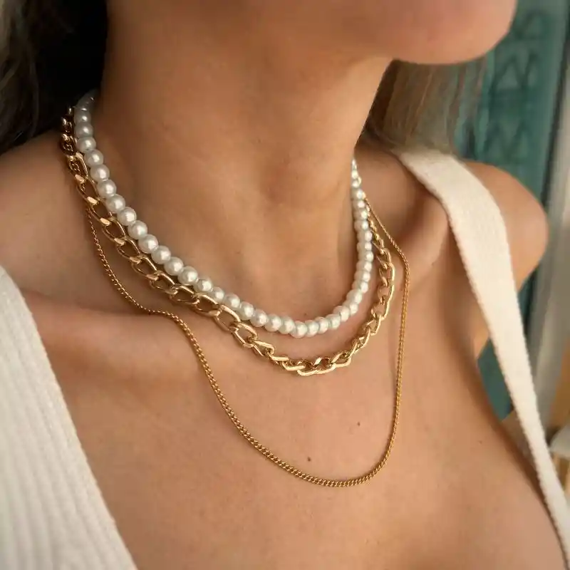 Set de tres collares, un diseño sobrio, sofisticado y en tendencia. Material: Acero, goldfield y perla de vidrio. Medidas: 47 cms, 39 cms, 33 cms + cadenita de extensión o alargue.