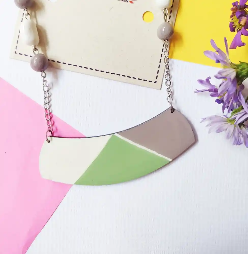 Collar moderno para mujer con diseño geométrico. ESPECIFICACIONES - Dije en forma geométrica con colores verde, beige y gris. - Cadena metálica con cuentas decorativas. - Estilo contemporáneo ideal para uso diario o eventos casuales. RECOMENDACIONES Perfecto para combinar con atuendos frescos y modernos. Ideal como regalo o accesorio para resaltar tu estilo. CUIDADO DEL PRODUCTO Evita el contacto con agua y perfumes para preservar el acabado y los colores.