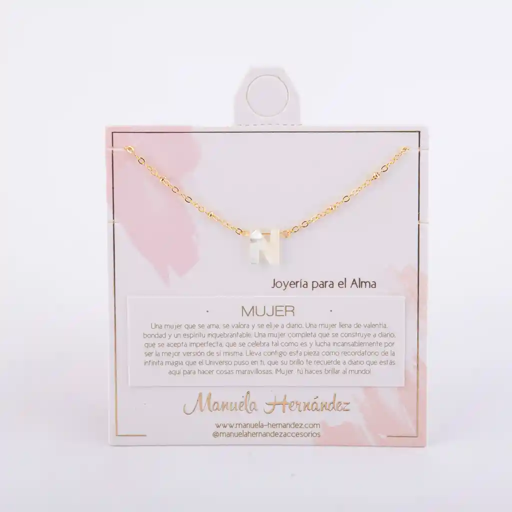 Esta pieza es un recordatorio para elegirte todos los días: incluso cuando dudes, incluso cuando no sea perfecto. 🤍💫 Llévala contigo como un “sí” a tu amor propio, a tu valentía y a esa magia que el universo puso en ti. Porque cuando tú te crees, tú brillas… y haces brillar todo a tu alrededor. 🫶🏻 Descripción de tu Producto - Tipo: choker (queda cerca del cuello) - Material protagonista: inicial elaborada en nácar genuino (brillo natural, tono marfil) - Cadena: delicada en acabado dorado con Baño de Oro 18k. - Estilo: minimalista, elegante y atemporal (ideal para layering o usar solo) - Significado: pieza personalizada que representa tu identidad y tu esencia - Ideal para: autoregalo, regalos especiales (cumpleaños, aniversario, graduación, mamá/hija/amigas) -Incluye: empaque/tarjeta con mensaje de la colección -Cuidado: evita agua, perfume y cremas directamente guarda la pieza separada para proteger el nácar y el brillo del metal - Longitud de la cadena: 40 cm. Sistema de broche ajustable de 7,5 cm para alargar el collar. - Elaborado en Nacar 100% Natural