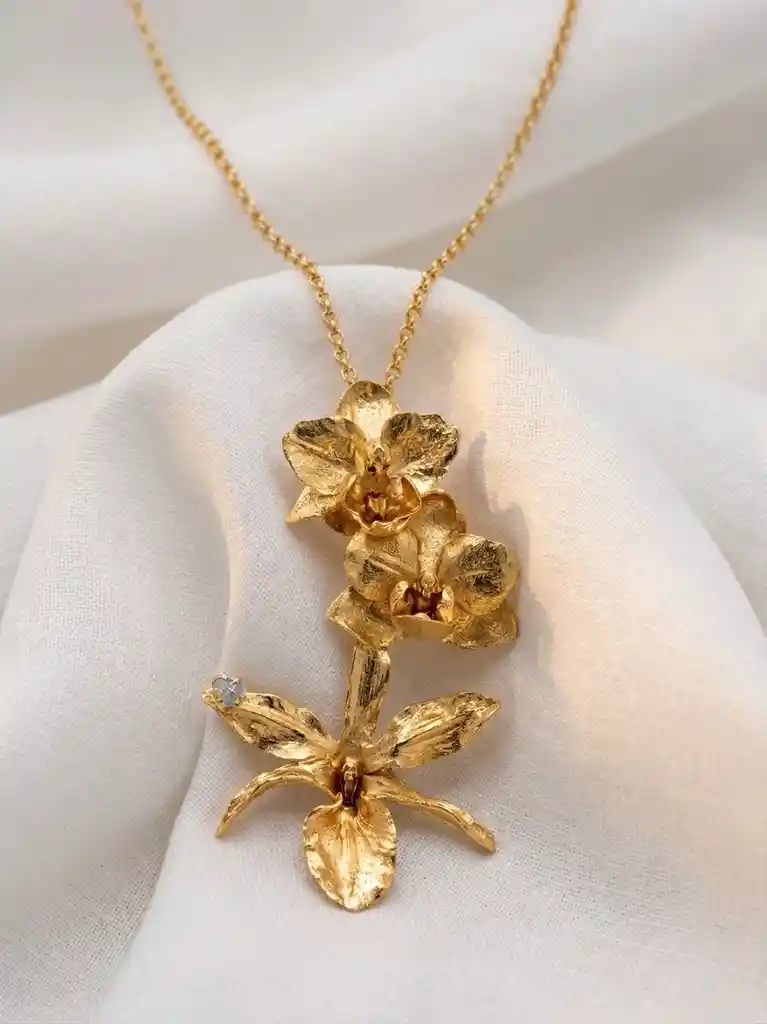 Dos orquídeas colombianas. Una sola pieza que no volverá a existir igual. Este collar nació de flores reales: una Phalaenopsis y una Baby Lluvia de Cereza, fundidas en bronce mediante el proceso de fundición orgánica y bañadas en oro 24k. Cada pétalo, cada nervio, cada curva es exactamente como la naturaleza lo dejó — capturado en metal para siempre. La orquídea Baby Lluvia de Cereza lleva una esmeralda murralla natural como detalle, una piedra colombiana que dialoga con el origen de las flores que dan vida a la pieza. El resultado es un colgante maxi de presencia extraordinaria: botánico, escultural, irrepetible. Como toda pieza Liz de la Cruz, esta joya es única. Las medidas varían ligeramente de pieza en pieza porque la naturaleza nunca se repite — y eso es exactamente lo que la hace tuya. DETALLES DE LA PIEZA Técnica: fundición orgánica de flores naturales en bronce Acabado: baño en oro 24k Piedra: esmeralda murralla natural Flores: Phalaenopsis + Baby Lluvia de Cereza Cadena: incluida, bañada en oro 24k Cierre: mosquetón