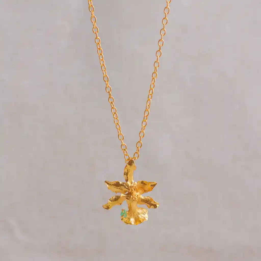 Esta joya nace de una orquídea chocolate real (Sharry Baby), inmortalizada mediante fundición orgánica para conservar cada detalle de su forma única. Con un dije de aproximadamente 3 cm (similar al tamaño de una cereza grande), esta pieza captura la esencia viva de una flor conocida por su elegancia y su aroma natural a cacao. Una pequeña esmeralda colombiana se posa delicadamente sobre uno de sus pétalos, como un destello de luz sobre lo natural. La orquídea chocolate simboliza la feminidad libre, la atracción dulce y el encanto de lo inesperado. Este collar es ideal para usar a diario o combinar en layering, como un recordatorio sutil de la conexión con la naturaleza. Hecho a mano en Colombia, a partir de una flor real. Cada pieza es irrepetible