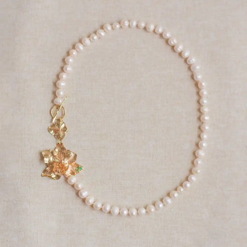 Este collar fusiona lo etéreo de las perlas con la fuerza simbólica de la naturaleza inmortalizada. A un costado, una orquídea Phalaenopsis real —símbolo de elegancia, fortaleza y belleza duradera— se entrelaza con delicadas hortensias, flores que evocan gratitud y renacimiento. Ambas fueron recolectadas y transformadas en joya mediante fundición orgánica, conservando cada nervadura y forma original. Una esmeralda colombiana resalta en el diseño con su tono verde profundo, como una nota viva entre la serenidad perlada. El baño en oro rosa sobre el bronce aporta un brillo suave y cálido. Con una longitud aproximada de 50 cm, esta pieza asimétrica ha sido pensada para el uso diario, pero guarda la fuerza estética de una pieza de exhibición. Un homenaje poético al equilibrio entre lo clásico y lo natural.