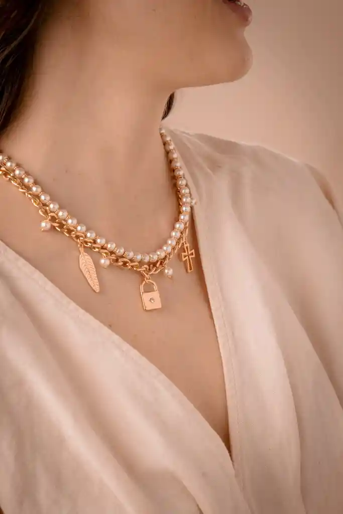 Collar elaborado en cuentas de perlas. Cadena con baño de oro. Dijes en zamak con baño de oro. Broche en acero inoxidable.Incluye aretes tipo topos con poste antialergico y baño de oro* Los aretes podrian variar segun disponibilidad