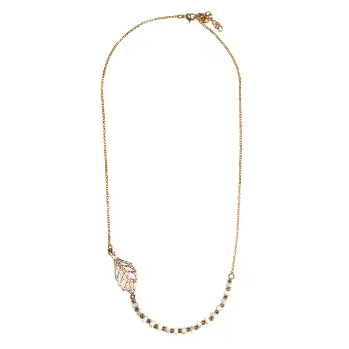 Collar con detalles mini perlas de rio, balines y hoja bañada en oro libre de niquel.
