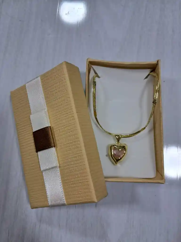 Este collar es una pieza única y elegante que te hará sentir segura y hermosa. El dije en forma de corazón es tallado con mucho cuidado en una piedra rosada radiante un toque de brillo y glamour.