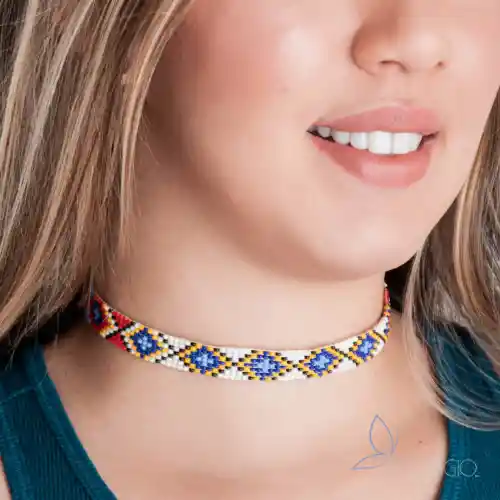 Collar hecho y tejido a mano en hilo celular, con chaquiras checas imitando la técnica miyuki. Adicional incluye aretas tipo topos de piedras imitación perlas naturales.