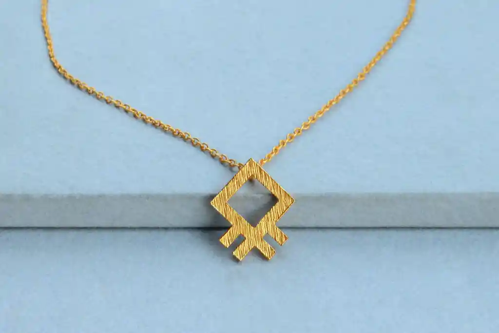 El collar Waitai recibe su nombre por su diseño similar a otro diseño indígena que simboliza un pez. El Putumayo es una región rodeada de varios cuerpos de agua, y el más importante de ellos es el río Putumayo. El nombre de este collar representa una actividad de vida diaria de todos los peces y otros animales que habitan en los biodiversos ríos de este departamento del sur de Colombia. Cadena: El collar tiene una cadena de eslabones pequeños de 38 cm y una cadena de expansión para ampliar la medida del collar hasta 6 cm. Medidas: El dije del collar mide 1,2 cm de largo por 1,5 cm de alto. Material: Las piezas metálicas son elaboradas a mano en bronce y tienen baño en oro mate de 24K.