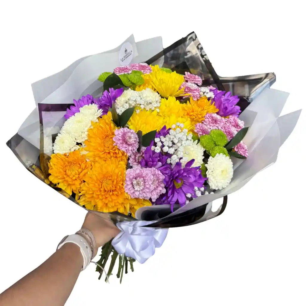 Ramo surtido de pompones y margaritas en tonos vibrantes (amarillo, morado, blanco, verde y rosa). Incluye gypsofilia y follajes. Envoltura en papel premium con moño satinado. Diseño colorido y de alta durabilidad.
