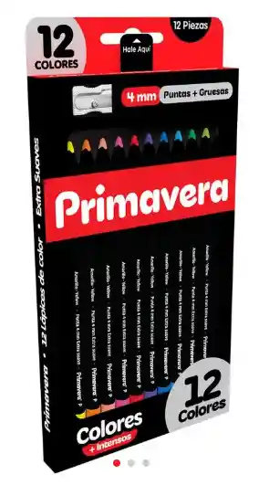 Estos son lápices de colores Primavera Black de 12 unidades. Son de la marca colombiana Primavera. Cuentan con una punta gruesa de 4 mm que permite un trazo suave. Los colores son intensos y brillantes. El paquete incluye un sacapuntas.