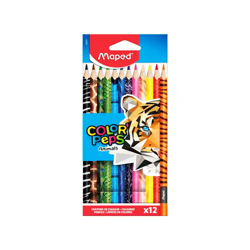 -Lápices de color 2.9 mm, Colores triangulares de madera para un agarre mas fácil y cómodo, Fáciles de afilar, Colores brillantes con estampado animal print -Medidas: 21 X 8.6 X 1 Cms, Peso: 72 gr