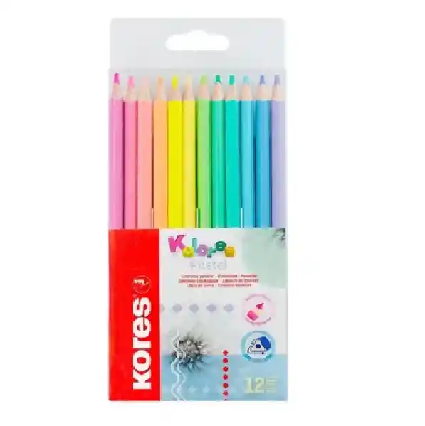 Kolores kores Pastel x 12 Unidades. Tonos de colores pastel brillantes y de moda. Forma triangular. Madera de alta calidad para un fácil afilado. Pigmentos extra de color pastel para colores intensos y vibrantes. Seguro para niños, no toxico