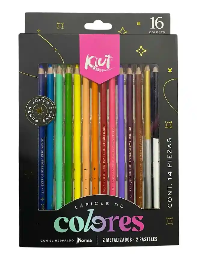 Caja de Colores Kiut x 14 lapices, 16 COLORES. Mina suave, mina resistente, diseño unico. Colore sin dejar espacios en blanco, agregale lindos detalles a tus apuntes. En su gama de color incluye 2 metalizados y 2 pasteles.