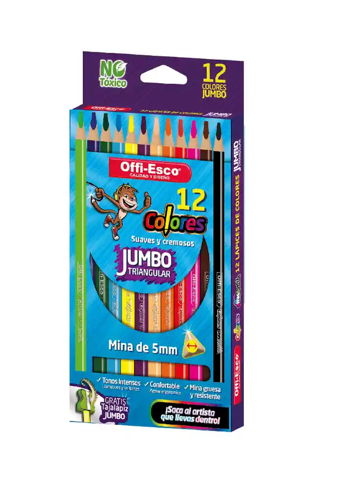 Colores Offi-Esco Jumbo x12 Triangular. Colores suaves y cremosos. Tonos intensos llamativos y brillantes. Mina gruesa 5mm y resistente.