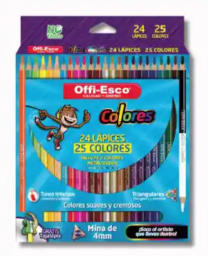 Caja de 25 colores Offi-Esco con tonos intensos, mina resistente y trazos suaves ideales para escuela, universidad o proyectos creativos. Excelente cubrimiento y fácil afilado.