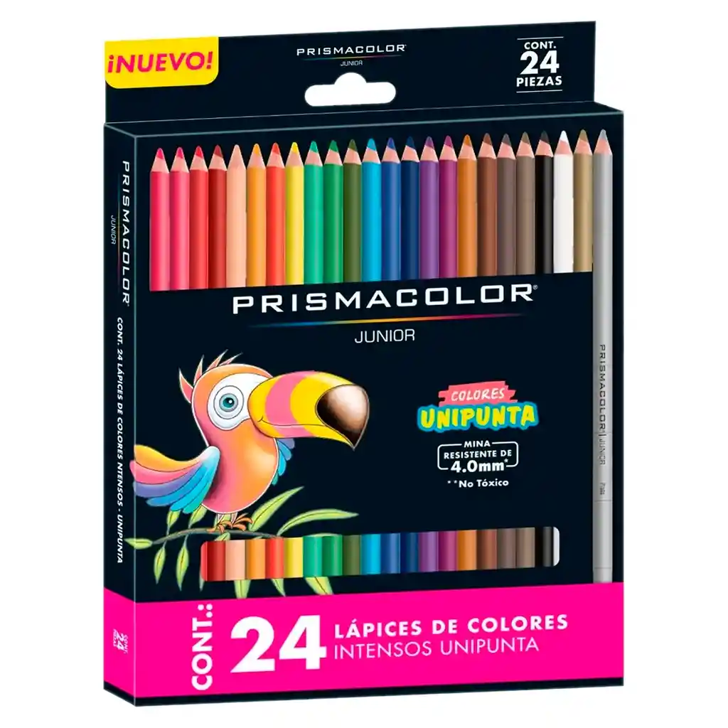 Prismacolor Junior Unipunta – Caja x24 Colores Intensos ¡Despierta la creatividad desde el primer trazo! Esta vibrante caja de 24 lápices Prismacolor Junior está diseñada especialmente para niños y jóvenes artistas que buscan calidad, color y diversión en cada proyecto. Colores intensos y suaves: mina gruesa de 4mm con alto contenido de cera para trazos brillantes, resistentes y de gran cobertura. Diseño ergonómico: cuerpo redondo de madera duradera, cómodo para manos pequeñas y grandes. Presentación llamativa: caja ilustrada con un colorido tucán que se convierte en caballete para exhibir los lápices. Seguro y confiable: producto no tóxico, ideal para uso escolar y actividades artísticas. Contenido: 24 lápices de colores unipunta, listos para acompañar cada idea con intensidad y estilo. Perfectos para tareas escolares, dibujos creativos o como regalo para pequeños artistas. ¡Con Prismacolor, cada color cuenta una historia!