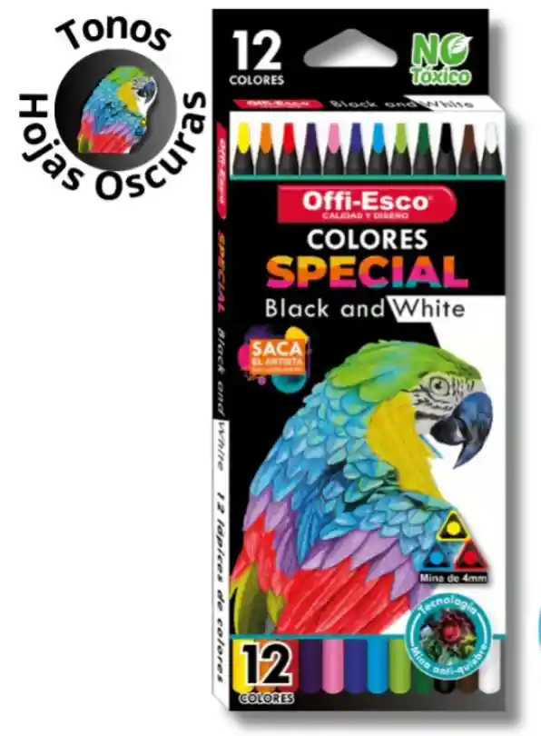 Colores Special Black and White Triangulares x 12 colores OE-131 • Colores special black and white 12 lápices / 12 colores • Son Unipunta • Mina resistente de 4 MM • Tecnología de mina anti-quiebre Disponibles: 6 Unidades