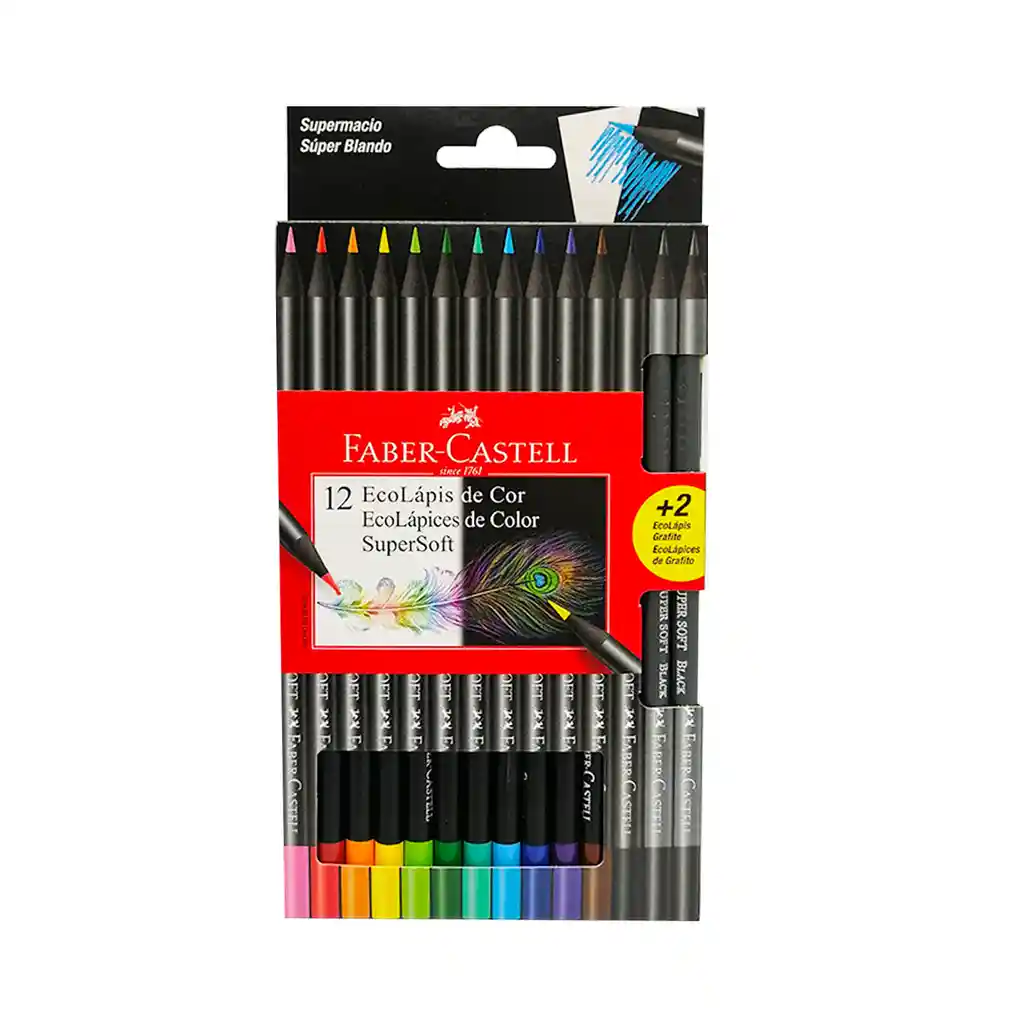 COLORES X 12 SUPERSOFT + 2 DE GRAFITO FABER CASTELL CONTENIDO DEL EMPAQUE 12 Lápices de Color + 2 de grafito DETALLES DEL PRODUCTO Clásicos lápices de color con cuerpo redondo con minas súper suaves y colores súper brillantes para superficies blancas y negras. Colores brillantes y únicos con una punta MAX resistente, técnica Sekural que es un proceso especial de fabricación que proporciona mayor resistencia a la mina. - Color largo redondo - Colores super suaves más vivos y con excelente cobertura, sobre papeles claros y oscuros. - Los lápices de colores clasicos han sido fabricados, utilizando exclusivamente pigmentos de alta calidad - La madera de los Eco-Lapices proviene de bosques sostenibles
