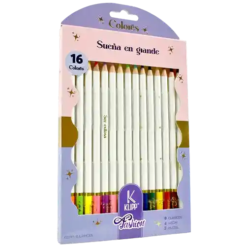 COLORES UNIPUNTA X 16UND 4 MM Producto: Lápices de colores clásicos Klipp Fashion. Cantidad: El paquete contiene 16 lápices de colores. Características: Diseño con barril blanco y puntas de colores. Texto motivacional en el empaque ("Sueña en grande", "Soy exitosa"). Incluye colores clásicos. El empaque menciona "4 NGON", que podría referirse a 4 colores neón o a la forma hexagonal de los lápices, aunque los resultados de búsqueda sugieren que Klipp maneja productos neón. Ideal para uso escolar, artístico o de oficina.