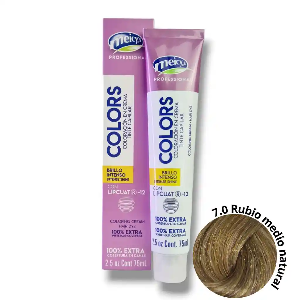 💛 Tinte Meicy’s Colors 7.0 Rubio Medio Natural – Coloración en Crema Profesional 🌼 Color natural, brillo intenso y cobertura total de canas El Tinte Meicy’s Colors 7.0 Rubio Medio Natural ofrece un tono rubio equilibrado, luminoso y elegante, ideal para quienes buscan un color natural con reflejos suaves y aspecto saludable. Su fórmula profesional con LIPCUAT® R-12 proporciona color uniforme, brillo extremo y 100 % cobertura de canas, mientras hidrata, protege y suaviza el cabello durante el proceso de coloración. ✨ Beneficios principales 💛 Tono rubio medio natural, con reflejos cálidos y luminosos. 💯 Cobertura total de canas, incluso en cabellos resistentes. 🌟 Brillo intenso y color duradero, con acabado profesional. 💧 Fórmula enriquecida con LIPCUAT® R-12, que hidrata y fortalece la fibra capilar. 🧴 Textura cremosa, fácil de aplicar y con excelente fijación del color. 🧪 Características del producto Tipo: Tinte permanente en crema. Tono: 7.0 Rubio Medio Natural. Presentación: Tubo de 75 ml (2.5 oz). Fórmula profesional con 100 % cobertura de canas. Uso doméstico o profesional. 💆 Modo de uso Mezcla el tinte con el oxidante Meicy’s en proporción 1 + 1½ hasta obtener una mezcla homogénea. Aplica sobre el cabello seco y sin lavar. Deja actuar de 30 a 40 minutos, según la intensidad deseada. Enjuaga con abundante agua y aplica acondicionador o tratamiento post coloración. 🌿 Ingredientes destacados 💎 LIPCUAT® R-12: complejo protector que aporta brillo, suavidad y sellado del color. 🥥 Aceites emolientes naturales: mantienen la hidratación y mejoran la textura del cabello. 🪶 Ideal para Personas que desean un rubio medio natural, radiante y elegante. Cabellos con canas o dañados, que requieren color y nutrición a la vez. Uso profesional o doméstico.