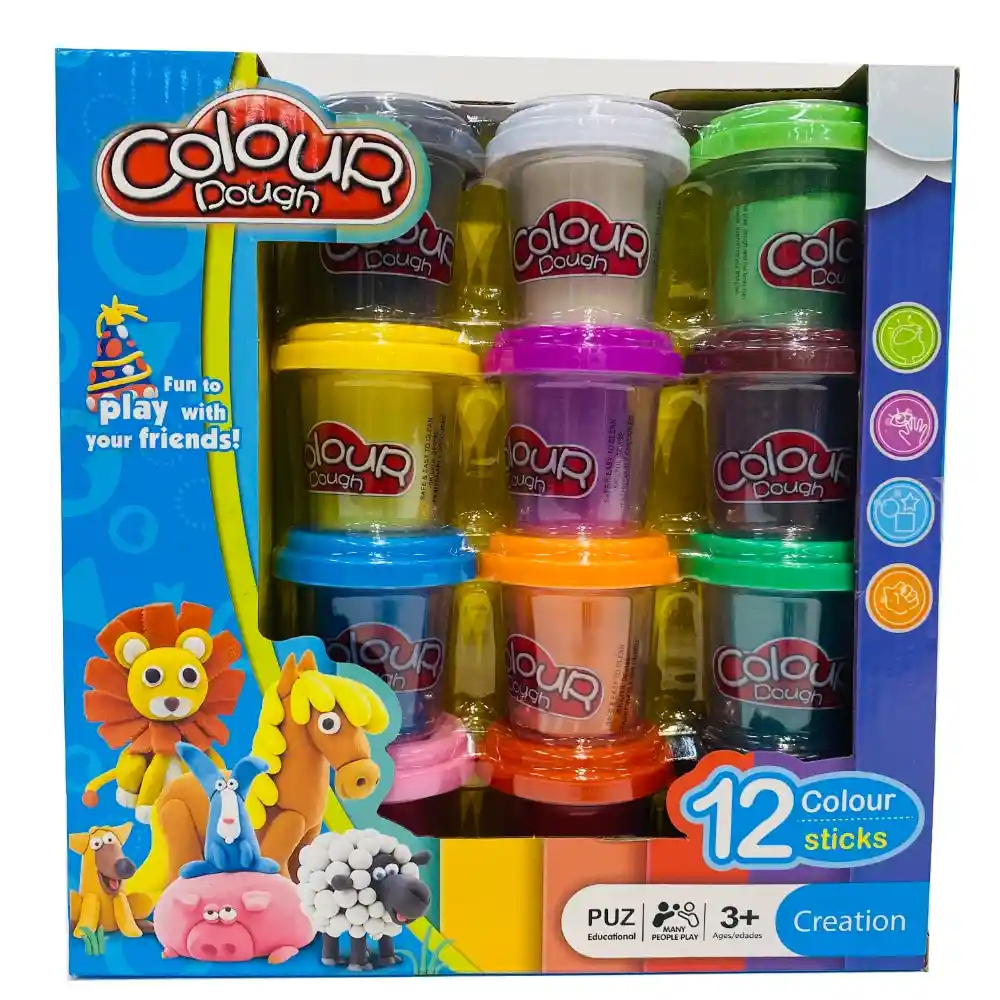 12 Colores surtidos de plastilina junto con moldes para tener horas y horas de entretenimiento ,dejando volar tu imaginación