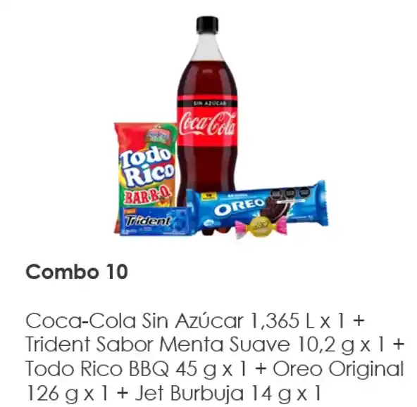 Coca-Cola Sin Azúcar 1,365 L x 1 + Trident Sabor Menta Suave 10,2 g x 1 + Todo Rico BBQ 45 g x 1 + Oreo Original 126 g x 1 + Jet Burbuja 14 g x 1