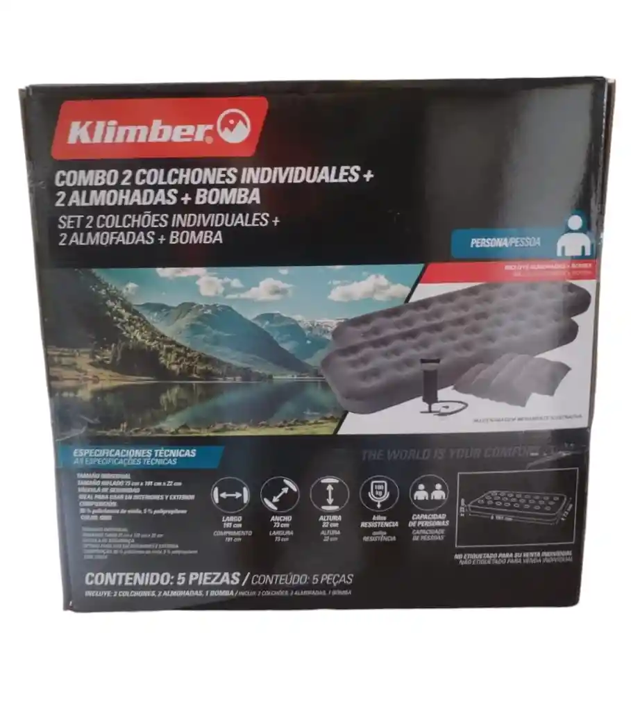 Combo 2 Colchones Inflables + 2 almohadas +1 Bomba para inflar los colchones ideal para camping vacaciones paseos. Nada como disfrutar de un tiempo de descanso y de actividades físicas cómodas y seguras. COMBO 2 COLCHONES INFLABLES SENCILLOS + 2 ALMOHADAS INFABLES + 1 BOMBA INFLADORA Colchón inflable ideal para realizar tus viajes de camping en la playa o en la montaña, este colchón inflable cuenta con válvula para un rápido inflado y desinflado Es ideal para uso en interior y exterior, cuenta con parche de reparación extra fuerte incluído y está elaborado en vinilo resistente probado. Este producto es de una marca reconocida a nivel mundial por la producción de los mejores elementos para la limpieza, seguridad y comfort para actividades deportivas, sus productos realzan la calidad de tus pertenencias, esta marca lleva años de producción que respalda la calidad de sus productos y la garantía de satisfacción. Esta marca es sinónimo de calidad y prestigio en todo el continente, disfruta de sus productos de forma segura con garantía de exportación. 2 Colchónes inflables + 2 almohadas + 1 bomba infladora. Elaborado en vinilo resistente probado. Tiene válvula para un rápido inflado y desinflado Cómoda superficie para dormir flocada. Ideal para uso en interior y exterior. Tiene parche de reparación extra fuerte incluído. Combo inflable para camping 2 Colchon Inflable + Inflador + 2 almohadas Tipo Combo Modelo NEPAL Marca KLIMBER Tamaño Colchón SINGLE Medidas 185 x 76 x 22 cm Largo 185 cm Ancho 76 cm Alto 22 cm Número de piezas 5 Incluye 2 colchon SINGLE + 2 Almohadas + 1 Bomba para inflar los colchones + 1 parche de reparación.