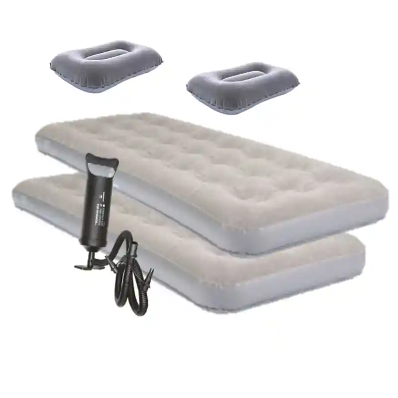 Combo 2 Colchones Inflables + 2 almohadas +1 Bomba para inflar los colchones ideal para camping vacaciones paseos. Nada como disfrutar de un tiempo de descanso y de actividades físicas cómodas y seguras. COMBO 2 COLCHONES INFLABLES SENCILLOS + 2 ALMOHADAS INFABLES + 1 BOMBA INFLADORA Colchón inflable ideal para realizar tus viajes de camping en la playa o en la montaña, este colchón inflable cuenta con válvula para un rápido inflado y desinflado Es ideal para uso en interior y exterior, cuenta con parche de reparación extra fuerte incluído y está elaborado en vinilo resistente probado. Este producto es de una marca reconocida a nivel mundial por la producción de los mejores elementos para la limpieza, seguridad y comfort para actividades deportivas, sus productos realzan la calidad de tus pertenencias, esta marca lleva años de producción que respalda la calidad de sus productos y la garantía de satisfacción. Esta marca es sinónimo de calidad y prestigio en todo el continente, disfruta de sus productos de forma segura con garantía de exportación. 2 Colchónes inflables + 2 almohadas + 1 bomba infladora. Elaborado en vinilo resistente probado. Tiene válvula para un rápido inflado y desinflado Cómoda superficie para dormir flocada. Ideal para uso en interior y exterior. Tiene parche de reparación extra fuerte incluído. Combo inflable para camping 2 Colchon Inflable + Inflador + 2 almohadas Tipo Combo Modelo NEPAL Marca KLIMBER Tamaño Colchón SINGLE Medidas 185 x 76 x 22 cm Largo 185 cm Ancho 76 cm Alto 22 cm Número de piezas 5 Incluye 2 colchon SINGLE + 2 Almohadas + 1 Bomba para inflar los colchones + 1 parche de reparación.