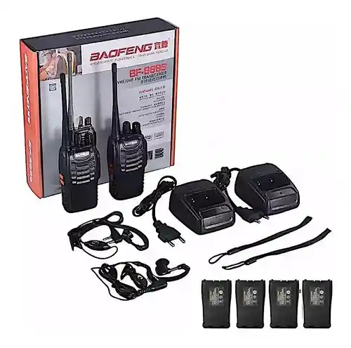 America Store te trae Radio Walkie Talkie Baofeng X2 Bf-888s + Baterías Extra 2800mah Frecuencia: 400-470MHz Canal de almacenamiento: 16 Voltaje de funcionamiento: 3.7V Capacidad de la batería: 2800 MAh Li-ion Estabilidad de frecuencia: ± 2.5ppm Temperatura de trabajo: -20 ° C - + 60 ° C Resistencia de la antena: 50O Rango de uso: 3 km - 5 km Potencia de salida: =5W Distorsión de audio: =5% Sensibilidad: =0.20 µV INCLUYE: 2 * FB-888S walkie-talkie. 4 * baterías recargables. 2 * antena. 2 * base de carga. 2 * clip posterior. 2* cordón. 2* Audífonos 1* manual