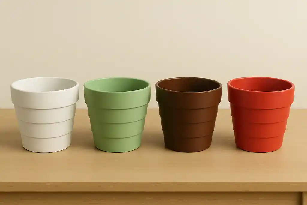 Combo x5 Materas Rayadas – Blanco, Verde Claro, Café y Rojo Diámetro : 18cm Largo: 14cm Dale vida a tus espacios con este combo exclusivo de materas en colores vibrantes y naturales. Su diseño moderno con líneas horizontales en relieve y acabado mate las convierte en la opción perfecta para decorar tu hogar, oficina o jardín.