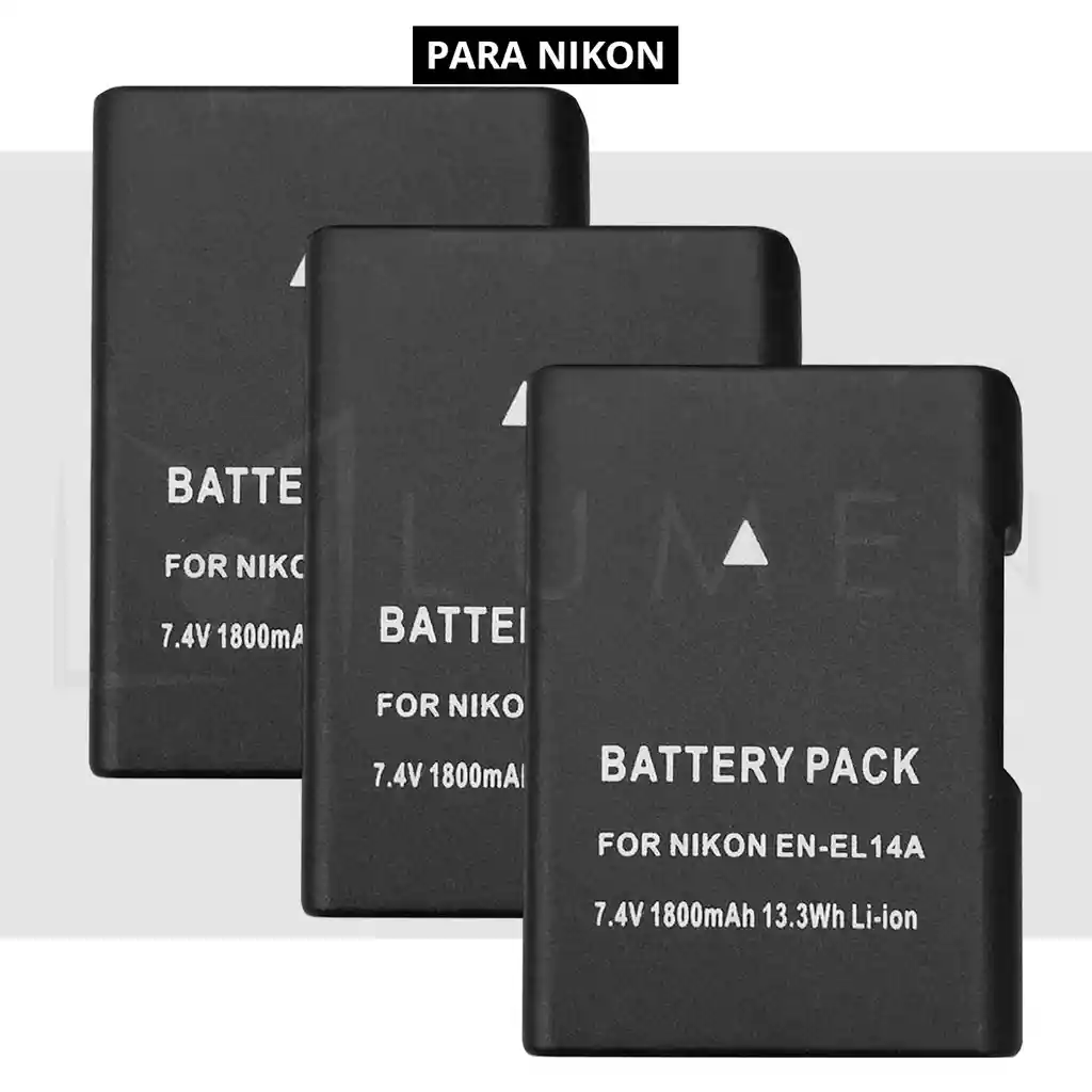 Alta potencia de 1.800 mAh.Extiende el número de tomas hasta un 35%.Memoria libre para un máximo rendimiento.Tecnología de avanzada Iones de litio 7.4v.Carga perfectamente con el cargador Original de Nikon.Compatible con cámaras Nikon D3100 D3200 D3300 D3400 D5100 D5200 D5300 D5400 D5500 D5600 COOLPIX P7000 COOLPIX P7100 COOLPIX P7700 COOLPIX P7800. Nikon Df.Paquete incluye:3x Baterías
