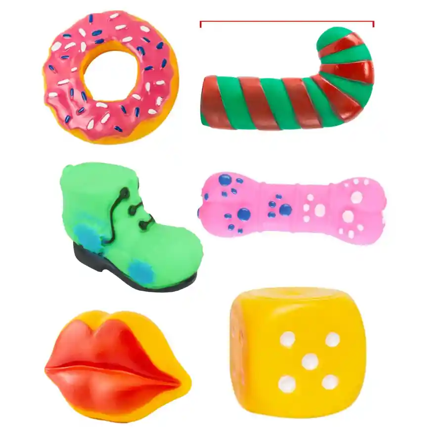 Este set combina la ternura de la temporada con la resistencia del caucho para darle a tu peludo horas de juego seguro y entretenido. ¡Perfecto para regalar o celebrar juntos! Incluye: • Bastón de dulce • Hueso • Bota • Beso • Dona • Dado (Todos en material de caucho resistente) Características: • Texturas firmes que estimulan la mordida • Diseños divertidos • Apto para perros pequeños y medianos ¡Una forma encantadora de consentir a tu mejor amigo!