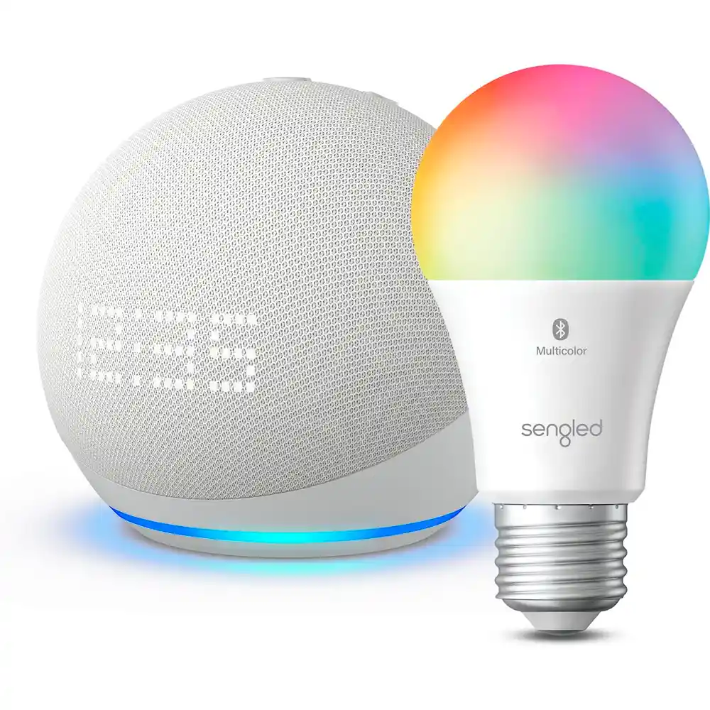 Súmate al mundo de la inteligencia artificial con el Amazon Echo Dot 5th Gen with clock que ofrece soluciones para automatizar algunas tareas en tu hogar. ● Controla tus luces sin levantarse: usa tu voz para controlar tu bombillo inteligente diciendo: "Alexa, enciende las luces" para una experiencia de manos libres. ● Fácil de configurar y usar: para configurar tu bombillo, conecta y configura tu dispositivo Echo, conecta tu bombillo y pregunta: "Alexa, descubre mis dispositivos". Usa tu voz para nombrar tu bombillo y comienza a usarla de inmediato. ● No se requiere un centro de hogar inteligente: configura rutinas y horarios a través de la aplicación Alexa. ● Amplía tu hogar inteligente: administra fácilmente tu hogar inteligente usando tu voz para encender las luces, ajustar los termostatos y cerrar las puertas con dispositivos compatibles. ● Colores brillantes para iluminar cada momento: enciende o apaga el bombillo que cambia de color, atenúa, ilumina, configura rutinas, horarios y más con la aplicación Amazon Alexa. Utiliza 16 millones de colores brillantes y suaves, además de blancos sintonizables, para crear el estado de ánimo perfecto; Alto brillo (800 lúmenes); Ideal para fiestas, entretenimiento y uso diario. ● Certificado para humanos, sin problemas, sin retoques, sin estrés. No se necesitas paciencia, en realidad es simple. ● Contenido: un (1) echo dot de quinta generación y un (1) bombillo inteligente.
