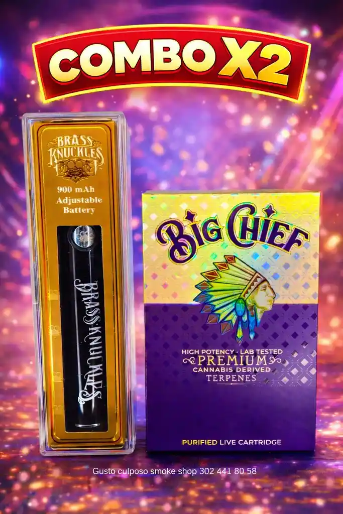 La combinación ganadora 🔥⚡. Este set trae 1 cápsula Big Chief de 1m, junto con la batería Brass Knuckles con puerto Tipo C, reconocida por su potencia, durabilidad y diseño elegante. Todo lo que necesitas para una experiencia de nivel pro, en un solo combo. Características 🌿 1 cápsula Big Chief de 1ml – destilado THC con terpenos naturales 🔋 1 batería Brass Knuckles Tipo C – recargable y de alto rendimiento 💨 Flujo de vapor constante y potente ⚡ Compatibilidad universal con cartuchos 510 📦 Presentación práctica y lista para usar Beneficios 🚀 Potencia y sabor premium desde el primer toque 😎 Set completo, ideal para usuarios exigentes ✨ Efectos duraderos y experiencia limpia 🔒 Calidad, estilo y practicidad en un solo combo