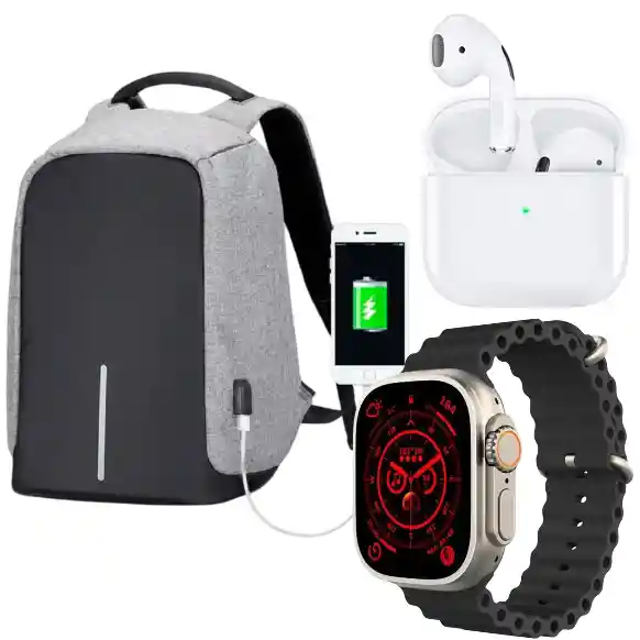 Combo tecnológico ideal para el ritmo urbano Este combo es perfecto para quienes viven en constante movimiento y necesitan estar siempre listos. Con un bolso antirrobo espacioso, audífonos Pro 4 para música y llamadas, y un smartwatch T800 Ultra que te mantiene al tanto de tu actividad y notificaciones, tendrás todo lo necesario para rendir al máximo. Detalles del combo: Bolso Antirrobo Grande Amplio compartimento con bolsillos organizadores. Puerto USB lateral para conectar tu power bank. Correas ajustables, acolchadas y diseño ergonómico. Material resistente, ideal para lluvia o salidas al aire libre. Audífonos Bluetooth Pro 4 Emparejamiento automático y sin interrupciones. Sonido estéreo de calidad con control táctil inteligente. Estuche cargador portátil para llevarlos siempre listos. Compatibles con cualquier dispositivo Bluetooth. Smartwatch T800 Ultra Gran variedad de funciones fitness y de monitoreo de salud. Alerta de mensajes, llamadas, apps y redes sociales. Múltiples esferas de reloj para personalizar el estilo. Batería duradera y carga rápida. Incluye garantía de 30 días por defectos de fábrica.