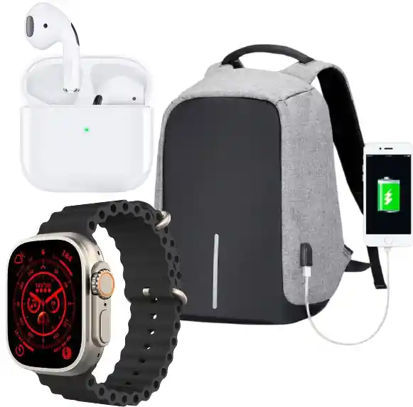 Conectividad, seguridad y estilo, todo en un solo combo Renueva tu rutina con este combo versátil que incluye tres productos indispensables para tu vida diaria. Desde la seguridad de un bolso antirrobo, hasta la conectividad de audífonos inalámbricos y un smartwatch de alto rendimiento, este pack lo tiene todo. Lo que obtienes: Bolso Antirrobo Grande Diseño moderno y minimalista con materiales resistentes al agua. Sistema antirrobo con cremalleras ocultas. Puerto USB externo para cargar tus dispositivos mientras te mueves. Correa ajustable y acolchada para máxima comodidad. Audífonos Pro 4 Bluetooth v5.0 + EDR para mayor alcance y estabilidad. Controles táctiles intuitivos para manejar música y llamadas sin tocar el teléfono. Sonido de alta fidelidad con buen aislamiento de ruido. Estuche con batería de respaldo de 350 mAh. Reloj Inteligente T800 Ultra Pantalla táctil de alta definición. Funciones de salud: monitor de ritmo cardíaco, oxígeno en sangre, control del sueño. Control remoto de cámara y música. Compatible con iOS y Android. Incluye garantía de 30 días por defectos de fábrica.