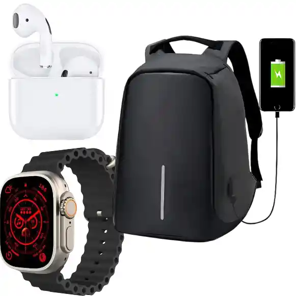 Conectividad, seguridad y estilo, todo en un solo combo Renueva tu rutina con este combo versátil que incluye tres productos indispensables para tu vida diaria. Desde la seguridad de un bolso antirrobo, hasta la conectividad de audífonos inalámbricos y un smartwatch de alto rendimiento, este pack lo tiene todo. Lo que obtienes: Bolso Antirrobo Grande Diseño moderno y minimalista con materiales resistentes al agua. Sistema antirrobo con cremalleras ocultas. Puerto USB externo para cargar tus dispositivos mientras te mueves. Correa ajustable y acolchada para máxima comodidad. Audífonos Pro 4 Bluetooth v5.0 + EDR para mayor alcance y estabilidad. Controles táctiles intuitivos para manejar música y llamadas sin tocar el teléfono. Sonido de alta fidelidad con buen aislamiento de ruido. Estuche con batería de respaldo de 350 mAh. Reloj Inteligente T800 Ultra Pantalla táctil de alta definición. Funciones de salud: monitor de ritmo cardíaco, oxígeno en sangre, control del sueño. Control remoto de cámara y música. Compatible con iOS y Android. Incluye garantía de 30 días por defectos de fábrica.
