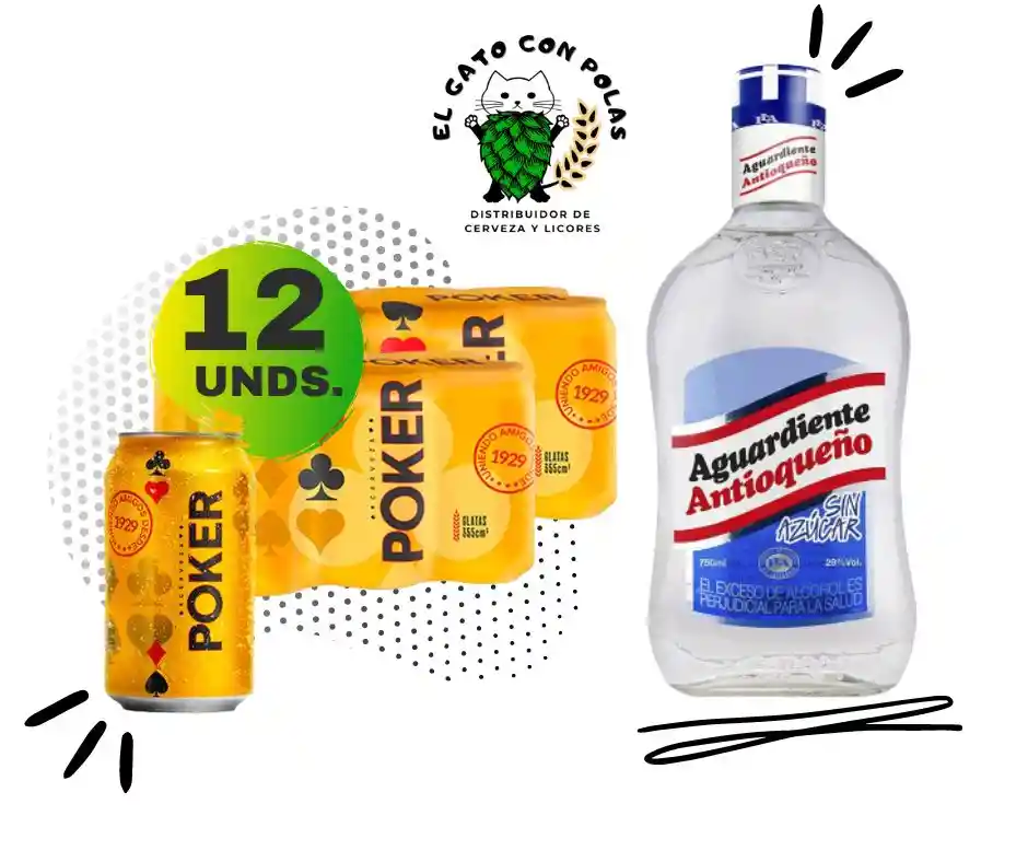 Contenido: * 1 Poker cerveza lager en lata 330 mL x 12 unidades * 1 Aguardiente Antioqueño azul 750 mL. Prohíbase el expendio de bebidas embriagantes a menores de edad. El exceso de alcohol es perjudicial para la salud.