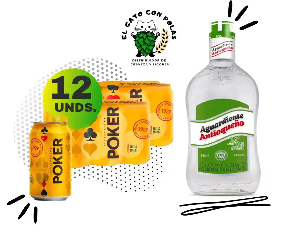 Contenido: * 1 Poker cerveza lager en lata 330 mL x 12 unidades * 1 Aguardiente Antioqueño verde 750 mL. Prohíbase el expendio de bebidas embriagantes a menores de edad. El exceso de alcohol es perjudicial para la salud.