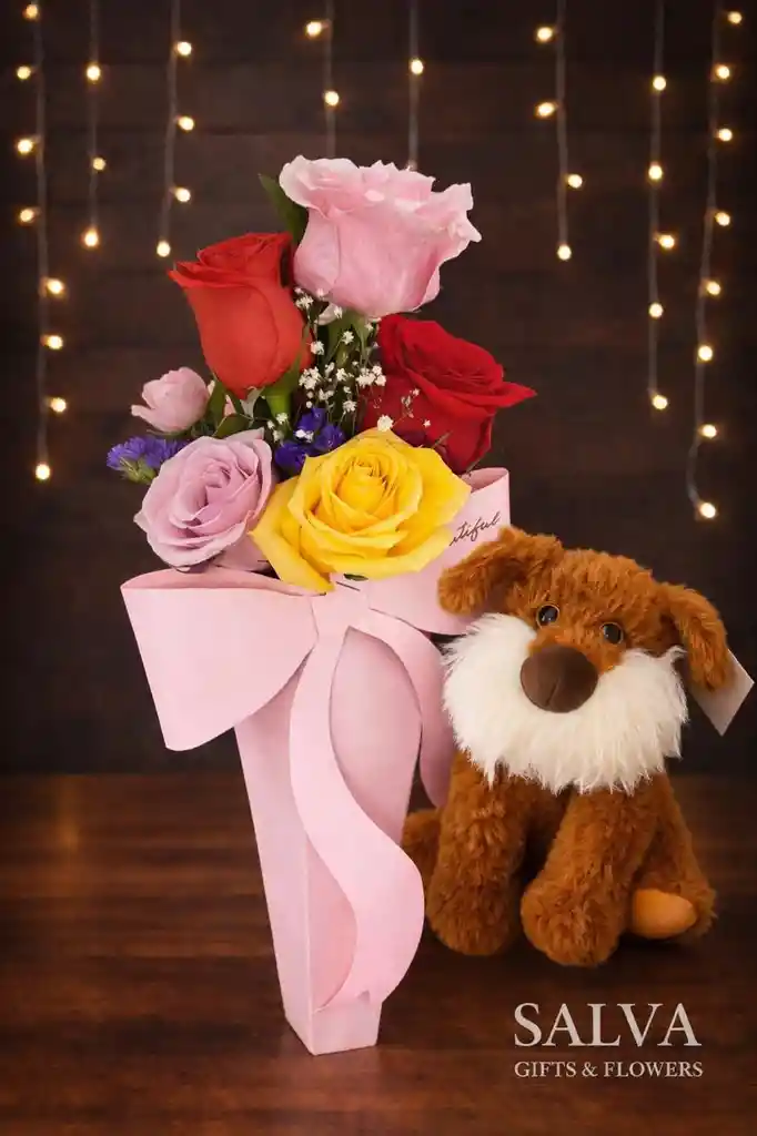 Sorprende con un detalle lleno de ternura y color 💕. Este hermoso combo incluye un bouquet de 5 rosas de colores cuidadosamente seleccionadas, presentado con elegante envoltura rosa y delicado lazo, acompañado de un adorable peluche tipo schnauzer, suave y perfecto para abrazar. Un regalo ideal para expresar amor, cariño o gratitud en cumpleaños, aniversarios, fechas especiales o simplemente para alegrar el día de alguien especial. ✨ Incluye: Bouquet de 5 rosas frescas en tonos Variados Presentación elegante con envoltura rosa premium Peluche schnauzer suave y tierno Producto listo para regalar 📌 Las flores pueden variar levemente según disponibilidad, manteniendo siempre la calidad y el estilo.