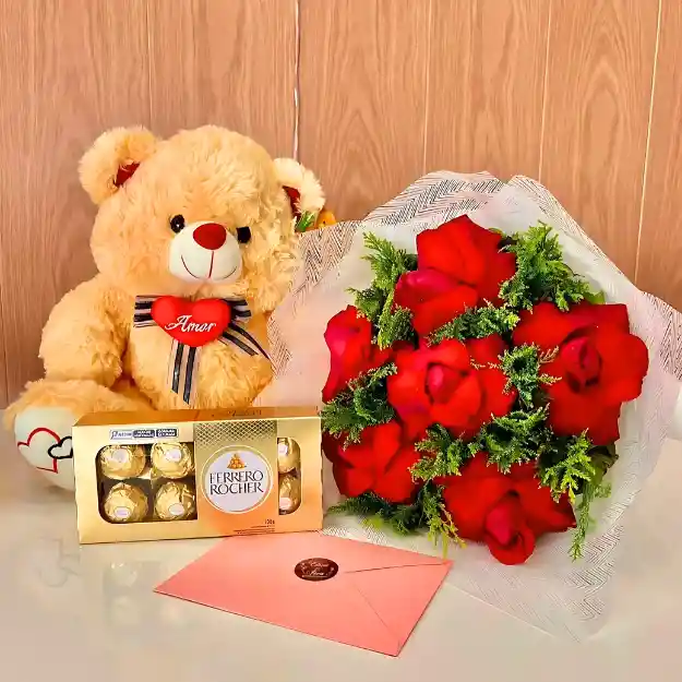 En MaríaCía sabemos que el amor se expresa mejor con flores, dulzura y ternura. Por eso, hemos creado este encantador combo que lo tiene todo: un bouquet de elegantes rosas rojas, símbolo de pasión y amor profundo, acompañado de chocolates Ferrero para endulzar el momento y un peluche mediano que abraza por ti. Ideal para sorprender en aniversarios, San Valentín, cumpleaños o simplemente para recordarle a esa persona cuánto significa para ti.