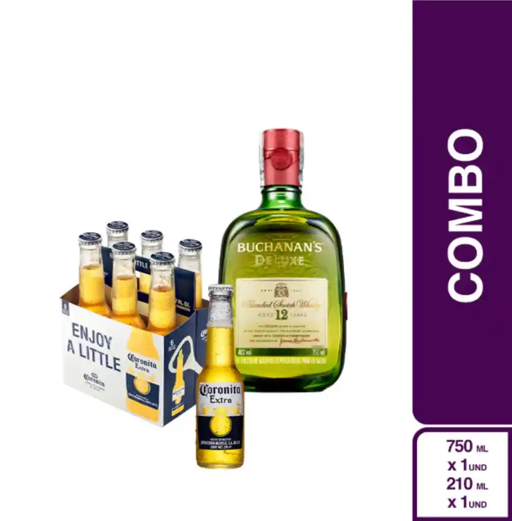 Contenido: Coronita Extra cerveza lager 210 mL x 6 und Buchanans Deluxe Whisky escocés 12 años x 750mL x 1 und
