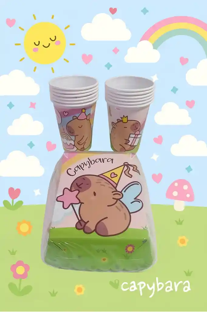 ¡Haz que la fiesta sea inolvidable con este encantador Set Capybara! Incluye 12 vasitos y 12 torteros con diseños coloridos y divertidos, perfectos para decorar mesas infantiles y servir postres o bebidas. Ideales para cumpleaños, reuniones escolares o cualquier celebración especial. ¡Prácticos, reutilizables y llenos de ternura!