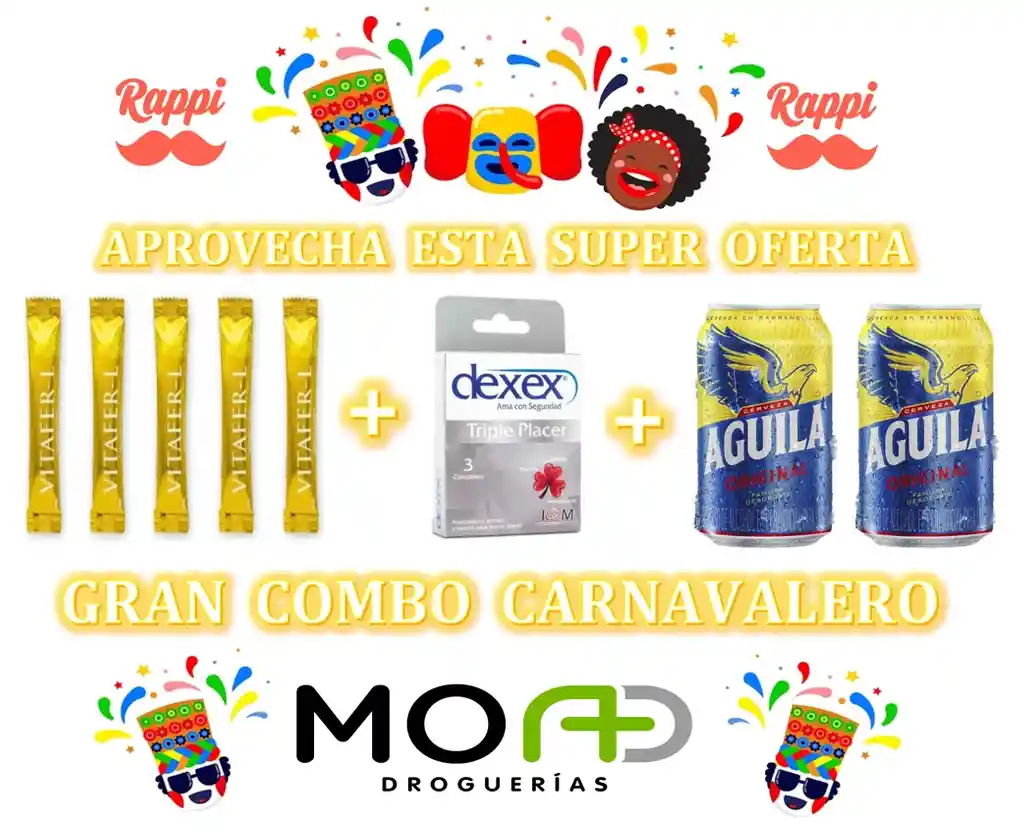 COMBO CARNAVALERO: 5 VITAFER L SACHET x 10 mL + PRESERVATIVO DEXEX TRIPLE PLACER x 3 UNIDADES + 2 CERVEZAS AGUILA ORIGINAL LATA x 330 cm3