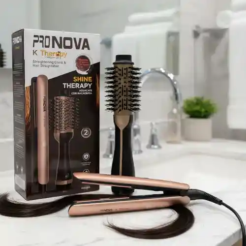 Cepillo secador: Este cepillo es un dispositivo 3 en 1 que cepilla, seca y da volumen al cabello en un solo paso. Cuenta con cerdas de nailon con puntas protectoras y un recubrimiento cerámico que distribuye el calor de manera uniforme, ayudando a reducir el frizz y la estática. Tiene 3 niveles de temperatura y 2 velocidades de aire, con una potencia de 1200 W para un secado rápido y eficiente. Plancha alisadora: La plancha está diseñada para alisar el cabello. El kit completo está formulado con "K Therapy" (terapia de queratina) y aceites como argán, aguacate y macadamia, que buscan nutrir, dar brillo y controlar el frizz.