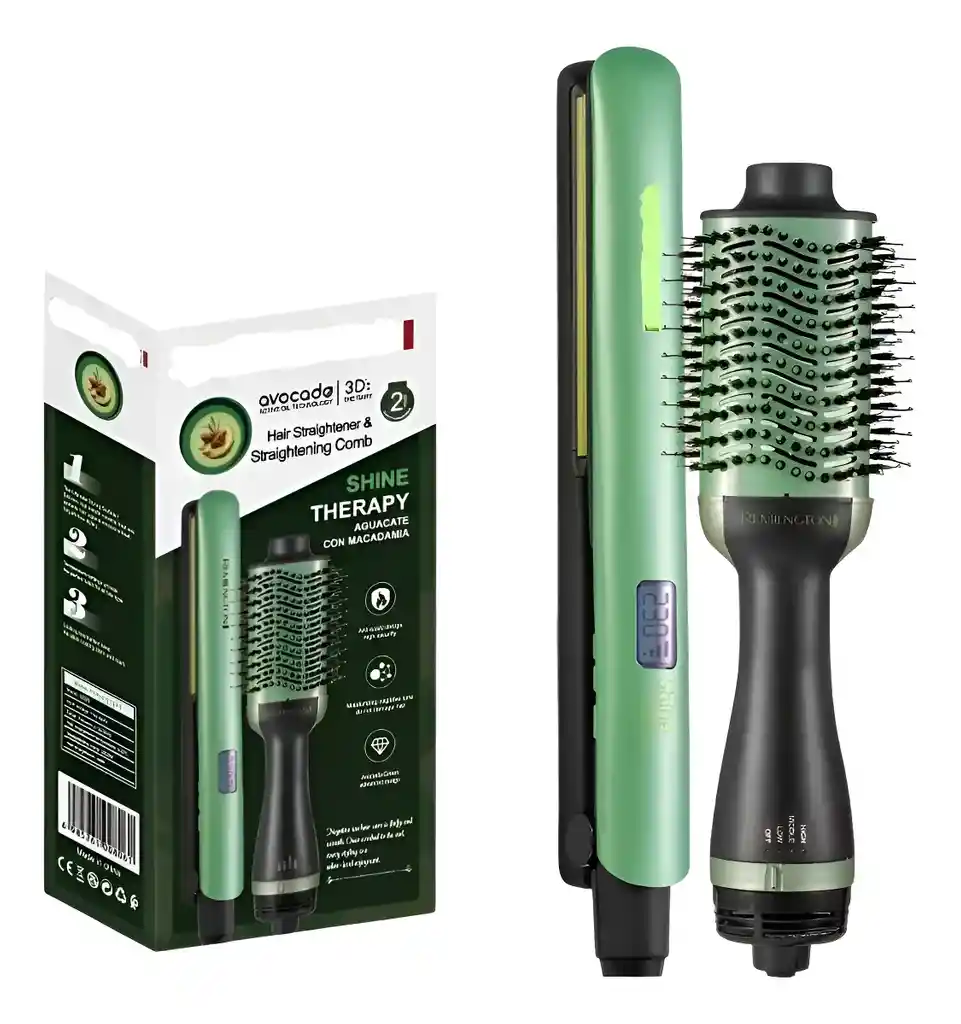 Revestimiento de Cerámica Avanzada: Las placas de la plancha y el revestimiento del cepillo secador están tratados con microacondicionadores de aguacate y macadamia que se activan con el calor, proporcionando brillo y reduciendo el frizz. Ajustes de Temperatura: La plancha cuenta con múltiples ajustes de temperatura (hasta \(230^{\circ }\text{C}\)), y el cepillo secador suele tener 3 velocidades y 3 temperaturas. Calentamiento Rápido: La plancha se calienta en 15 segundos, y el cepillo secador tiene calor instantáneo. Potencia del Cepillo Secador: El cepillo secador tiene una potencia de \(2000\text{W}\). Voltaje: El voltaje del cepillo secador es de \(110\text{v}-240\text{v}\). Cable Giratorio: Ambos productos suelen contar con un cable giratorio de \(360^{\circ }\) para facilitar su uso y prolongar la vida útil. Funciones Adicionales: La plancha tiene placas flotantes para una presión uniforme y función de bloqueo de temperatura y apagado automático. El cepillo secador es 3 en 1: suaviza, da forma y añade volumen.